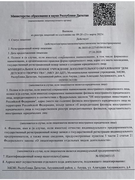 - Места осуществления образовательной деятельности по дополнительным образовательным программам: Акушинский район